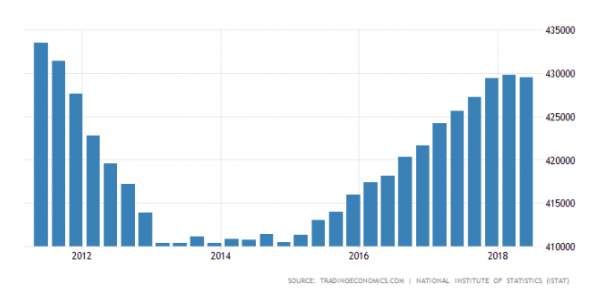 Comme on peut le voir, en 2011-2013, la baisse du PIB a duré sept trimestres, suivie de huit trimestres de stagnation avant une reprise qui a débuté en 2015 et s'est poursuivie jusqu'aux premiers mois de 2018. Bien que, dans ce cas également, sa partie ascendante ne soit pas complètement remplie, le graphique décrit cette fois-ci un U et non un V. En 2011-2013, la baisse du PIB est moins intense et quantitativement moins importante que celle observée en 2008-2009 (23 milliards en sept trimestres contre 33 milliards en cinq trimestres en 2008-2009). Mais il y a une stagnation et une lente reprise, qui gagne cependant en consistance au fil des trimestres pour compenser presque complètement la perte subie pendant la récession. La consommation et le marché intérieur sont en baisse : il s'agit donc d'une récession très généralisée, tant sociale qu'économique, qui a laissé des signes sérieux dans le tissu économique de notre pays avec la disparition de nombreuses entreprises et l'effondrement – avec une récupération encore incomplète à ce jour – du secteur de l'immobilier et de la construction. La crise de confiance s'est ajoutée à l'adoption de politiques budgétaires (nécessairement) restrictives.