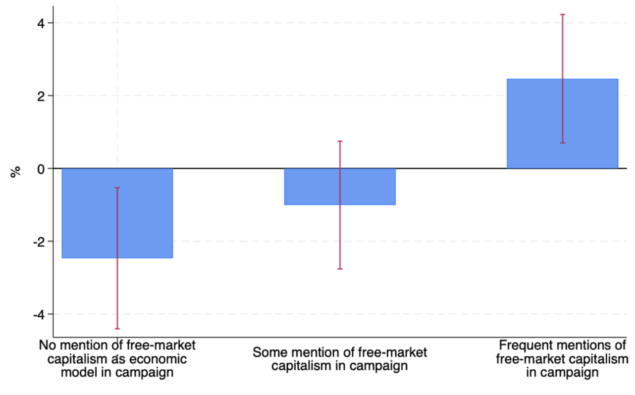 En ce qui concerne les réductions de dépenses, nos résultats remettent en question l’idée selon laquelle toutes les formes d’austérité sont politiquement néfastes. Nous constatons qu’en moyenne, les réductions de dépenses ne sont pas associées à un changement significatif de la part de voix du gouvernement qui les a introduites. Mais lorsque nous prenons en compte les manifestes économiques, nous constatons que cela a une grande importance. Les partis qui ont fait campagne sur un programme d’économie de marché gagnent des voix après la formation d’un gouvernement qui annonce un programme d’austérité consistant en des réductions de dépenses. Ce résultat est complètement inversé pour les partis qui n’ont pas fait campagne sur un programme d’économie de marché : ils perdent des voix après une austérité basée sur les dépenses.