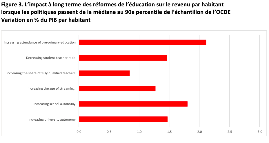 Certaines de ces politiques éducatives sont ainsi d’un « bon rapport qualité-prix », si l’on ose s’exprimer ainsi. Elles présentent le double avantage de stimuler le capital humain et de réduire les pressions sur les dépenses. Il s’agit en particulier de l’augmentation de la fréquentation de l’enseignement préprimaire, d’une plus grande autonomie des universités et de la réduction des obstacles au financement des étudiants de l’enseignement supérieur. Une plus grande autonomie des écoles aux niveaux primaire et secondaire améliore les résultats scolaires, mais ne réduit pas les dépenses. Enfin, l’augmentation du ratio élèves/enseignant, l’augmentation de l’âge de la première orientation et la réduction de l’étendue de l’orientation stimulent également le capital humain, mais à un coût plus élevé.
