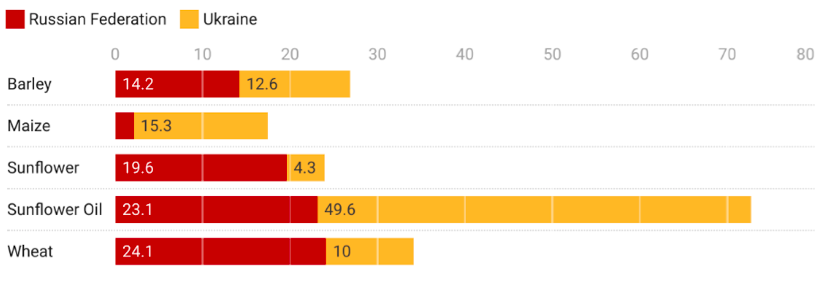 Graphique 1. Part de la Russie et de l’Ukraine dans les exportations mondiales de 5 produits agricoles - 2020