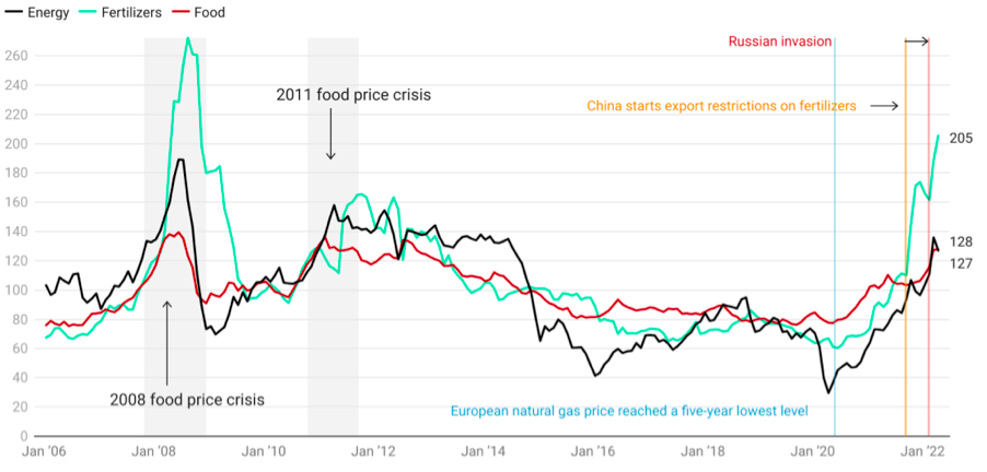 Enfin l’observation de l’évolution à long terme du prix des fertilisants comparé à un indice synthétique des prix de la nourriture et de l’énergie (graphique 4) est instructif : les prix des fertilisants ont initié une trajectoire ascendante au début de l’année 2020, bien avant février 2022.