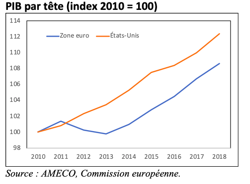 Mais pourquoi la situation de la zone euro est-elle plus inquiétante que celle des États-Unis ? En bref, parce que des erreurs graves ont été commises en Europe. La banque centrale américaine s’est engagée dès 2008 dans une politique d’assouplissement quantitatif (QE ou Quantitative Easing), une décision que la BCE n’a prise que six ans plus tard. La Fed a aussi immédiatement baissé ses taux d’intérêt alors que la BCE a agi avec circonspection, les augmentant même en 2012 avant de se raviser. Durant cette même période, la Commission européenne a promu l’austérité budgétaire comme la solution à l’accroissement des dettes publiques. Elle a pu imposer cette stratégie aux pays en crise (Grèce, Irlande, Portugal, Espagne puis Chypre) qui avaient dû se résoudre à demander de l’aide. Ailleurs, l’Allemagne, qui a promu l’austérité, a donné l’exemple, suivie des Pays-Bas et de l’Autriche. La France a suivi en maugréant. La figure ci-dessous décrit l’évolution du PIB par tête en zone euro et aux États-Unis. Pour rendre la comparaison facile, le PIB par tête est indexé à 100 en 2010. La figure montre que le retard pris dans ces trois années 2011 à 2013 n’a jamais été comblé. Entre 2010 et 2018, c’est 4% de revenus que la zone euro a perdus relativement aux États-Unis. C’est énorme.