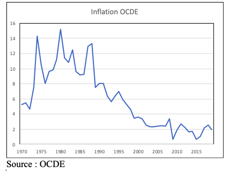 Un petit retour en arrière, illustré par les figures qui indique le taux moyen d’inflation dans les pays de l’OCDE, est intéressant. Jusqu’aux années 1980, le défi pour les banques centrales consistait à contenir l’inflation. Puis on y est parvenu dans les pays avancés. La recette tenait en deux mots : indépendance et persistance. Les banques centrales ont obtenu d’être indépendantes de leurs gouvernements et elles ont alors pu librement utiliser leurs taux d’intérêt pour stabiliser l’inflation à des taux très faibles. Elles ont alors publiquement adopté une cible d’inflation, généralement aux alentours de 2%, et elles s’y sont tenues. Ce succès historique s’est traduit par un haut niveau d’admiration professionnelle pour les banques centrales et, de leur part, par un degré élevé d’autosatisfaction. La question de la politique monétaire était réglée, définitivement. Sauf que, dans cette ambiance apaisée, les banques centrales ont relâché l’attention en matière de stabilité financière. Ce qui devait arriver, arriva, et ce fut en 2008, la grande crise financière. Depuis, les banques centrales ne semblent pas pouvoir faire remonter l’inflation. C’est le monde à l’envers. Auparavant, la difficulté était d’atteindre et de maintenir un bas taux d’inflation, et voilà qu’il semble encore plus difficile de faire l’inverse.