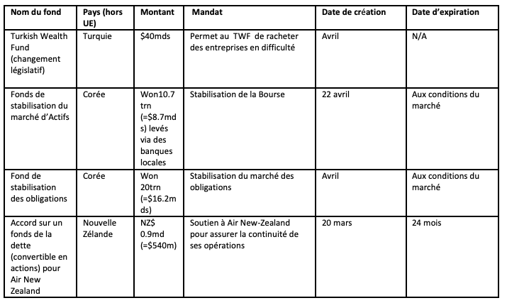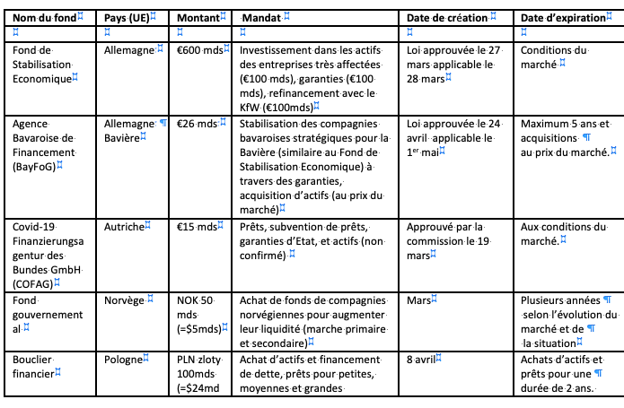 Un tel mécanisme permettra également aux États de participer à la reprise que la dépense publique se doit de faciliter, et de s’assurer que l’argent public n’est pas distribué sans conditions aux secteurs les plus touchés. Cela aidera à rétablir la confiance des électeurs par rapport aux fonds largement distribues par le passé, et permettra de rendre des comptes au contribuable. Ces avantages ont conduit l’Allemagne à créer en avril 2020 un Fond de stabilisation économique (Wirtschaftsstabilisierungsfonds), avec des actifs pour 600 milliards d’euros, dont 100 milliards seront dédiés à l’investissement, 400 milliards aux garanties de prêts et 100 milliards au refinancement à travers la banque d’Etat, le groupe KfW. De même le gouvernement autrichien a créé l’agence COVID-19 Finanzierungsagentur des Bundes (COFAG). La Norvège a mis en place quant à elle un fond temporaire, le Government Bond Fund, avec 5 milliards de dollars de liquidités auxquelles les entreprises peuvent avoir recours pendant la crise du Coronavirus (voir tableau ci-dessous).
