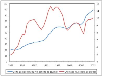 Pour commencer, il y a cette bonne vieille idée que la discipline budgétaire nuit à la croissance et à l’emploi. C’est vrai à court terme, et c’est l’un des arguments toujours employés pour, encore une fois cette année, laisser filer le déficit pour la dernière fois. C’est la raison pour laquelle, la petite austérité des plans Fillon 1 et 2 est un contresens économique qui va sans doute coûter sa réélection à Nicolas Sarkozy (sujet précédemment traité ici). Mais les déficits continus n’ont aucune justification économique. Pire, à long terme, l’accumulation de la dette publique est source de croissance faible et de chômage. La figure ci-dessous en offre une illustration spectaculaire. Depuis 1977, endettement de l’État et chômage ont augmenté presque en parallèle. Dans les détails, à court terme, les périodes d’accélération de l’endettement coïncident avec la montée du chômage. A court terme, ce n’est pas la dette qui fait grimper le chômage, mais l’inverse. Plus de chômage, c’est plus d’allocations et moins de rentrées fiscales. Mais ce sont aussi d’innombrables plans de traitement social du chômage, souvent accompagnés de subventions aux entreprises, qui ne produisent aucun effet détectable à l’œil nu. Conclusion : deux ou trois ans de déficits pour faire face à un ralentissement conjoncturel, c’est le bon sens, mais il faut alors avoir des surplus pour rembourser la dette accumulée pendant cette période. Ce sont ces surplus en période de croissance revenue qui n’ont jamais existé depuis quarante ans. Et maintenant, il ne s’agit pas seulement de rembourser les dernières années de récession, mais quarante années de folie. Cela va prendre sans doute des années, de l’ordre d’une ou deux générations, mais il est faux de croire que ce ne sera pas contractionniste sur le long terme. On le sait, parce que beaucoup de pays l’ont fait.