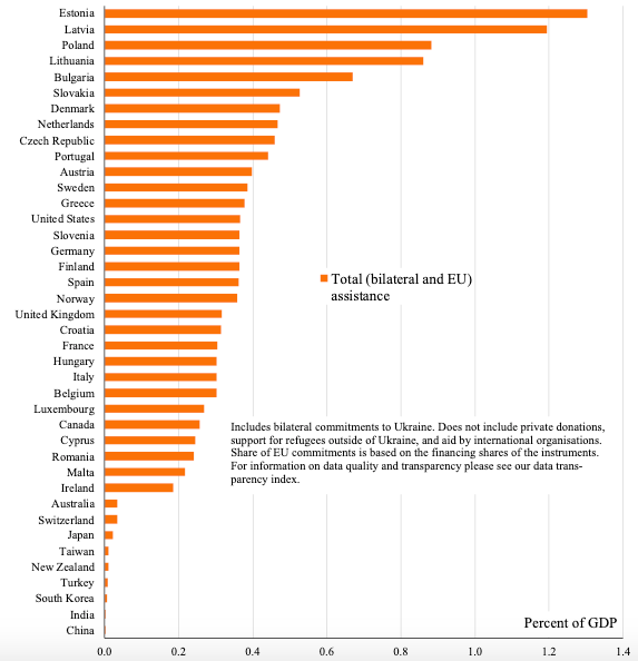 Combien de temps un tel semblant de normalité est-il possible ? C’est une question sans réponse, bien sûr. Comme pour l’aspect militaire, Poutine mise sur une lassitude des soutiens. Déjà on entend la petite musique de ceux qui se plaignent des sommes dépensées. D’après l’Institut de Kiel, entre janvier 2022 et janvier 2023, les promesses d’aide à l’Ukraine atteignent 143 milliards d’euros, y compris le matériel militaire, l’aide financière et l’aide humanitaire. Impressionnant ? Pas du tout. Pour les États-Unis qui viennent et tête (en gros la moitié des montants promis), cela ne représente que 0,37% du PIB. En tenant compte des sommes qui transitent par l’UE, les promesses de la France, de l’Allemagne et de la Grande-Bretagne représentent respectivement 0,31, 0,36 et 0,32% de leurs PIB respectifs. Pour la France, cela correspond à deux mois du budget militaire. La figure ci-dessous montre que ce sont les pays de l’Est qui sont les plus grands contributeurs, mais ils sont bien petits.