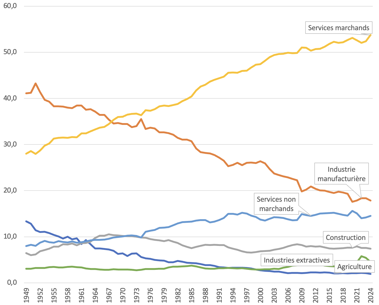 Le constat est le même en termes de valeur ajoutée (production diminuée des consommations intermédiaires), la part de l’industrie manufacturière passant de 29% en 1951 à moins de 11% en 2024, selon une tendance tout aussi régulière.
