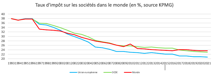 La réalité est bien sûr tout autre. Par évasion fiscale, l’entreprise laisse son investissement en France et déplace ses profits en Irlande. Ainsi, elle se fait rembourser ses dépenses à 28% en France et acquitte 12,5% sur ses profits en Irlande. Le fisc français se fait voler la différence par le fisc irlandais à hauteur de 12,5% et par l’actionnaire pour le reste. La réaction première, défensive et non coordonnée d’un État à une telle prédation est de baisser son taux et ainsi d’entamer une spirale baissière. Comme le montre le graphique qui suit, c’est bien dans un mouvement de la sorte que se sont engagés tous les grands pays de la planète.