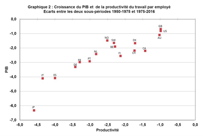S’il n’a pas eu d’effet sur l’emploi, quel a donc été l’effet du ralentissement de la productivité ? Le Graphique 2 montre qu’il s’est totalement transposé dans la croissance du PIB. Les pays dans lesquels la productivité a connu le ralentissement le plus fort dont aussi ceux dans lesquels la croissance du PIB a le plus diminué, la relation observée étant quasiment de un pour un. Ainsi, au total, le ralentissement de la productivité observé après le premier choc pétrolier n’a pas été favorable à l’emploi mais il a par contre été défavorable à la croissance et donc à l’élévation du niveau de vie économique moyen.