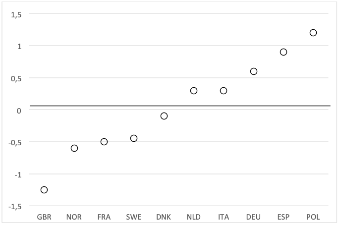 Figure 2. Différences par pays des taux de mobilité sociale relative (hommes 25-64 ans) (paramètres UNIDIFF, moyenne=0) Source : Bukodi et al.
