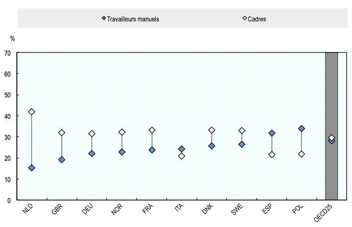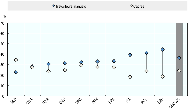 Figure 1. Mobilité intergénérationnelle entre les emplois de travailleurs manuels ou les emplois routiniers et les emplois d’encadrement dans quelques pays européens (Source OCDE)
