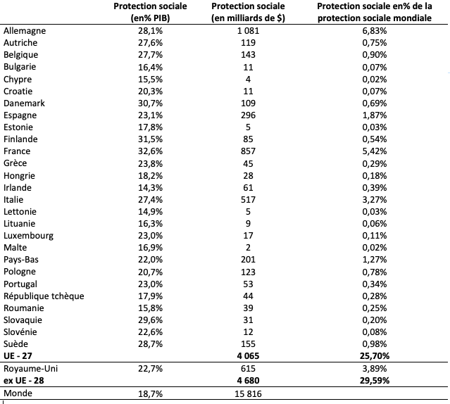 Si les données nationales sur la population, le PIB et les dépenses sociales sont assez aisément disponibles, les calculs pour l’Union européenne s’avèrent assez compliqués. En effet, l’Union européenne n’est pas un agrégat statistique systématiquement traité dans les documents et bases de la Banque mondiale, de l’ONU ou de l’OIT. Il faut donc reconstituer l’Union, par addition de chacun des États-membres. C’est ce dont rendent comptent les trois tableaux qui suivent. Où chaque pays, dont la France, retrouvera ses petits.