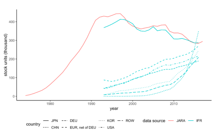 Source : International Federation of Robots (IFR) et Japan Robot Association (JARA).