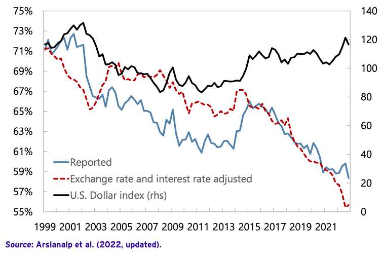 Les sceptiques objectent que ces données sont faussées par les variations des taux de change. Le dollar s’est renforcé tout au long des trois premiers trimestres de 2022, ce qui aurait pu faire grimper la valeur des réserves en dollars et la part de la monnaie dans les portefeuilles de réserves.