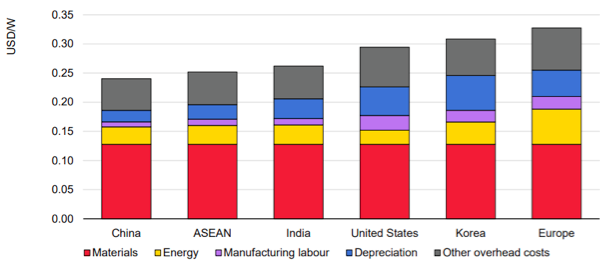 Figure. Les différences de coûts de production de panneaux PV par composants entre régions (en $/W)
