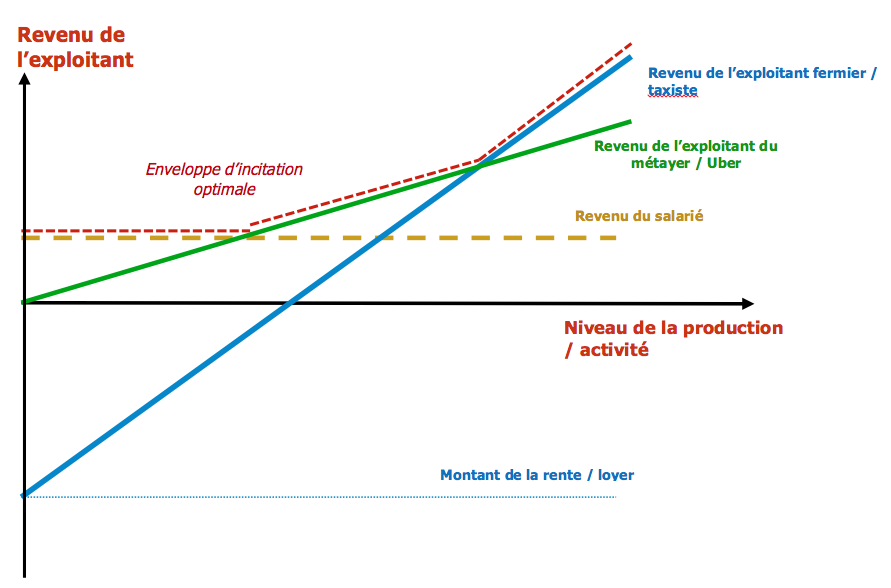 La courbe verte trace le revenu que garde le métayer ou chauffeur d’Uber : un simple pourcentage de la production, parfois de la production nette des coûts. Le métayer est en quelque sorte en position de co-actionnaire ou de partenaire. On comprend la dénomination de « partenaire chauffeur » qu’emploie pudiquement Uber pour éviter la requalification en salarié. La courbe bleue décrit la position du fermier, qui doit s’acquitter d’un loyer de la terre, et qui est perdant tant que sa production nette est inférieure au loyer, mais qui bénéficie d’une courbe plus pentue que celle du métayer. Ajoutons au graphique la position du salarié agricole qui touche un salaire indépendant de la production : la courbe en pointillé ocre est plate.