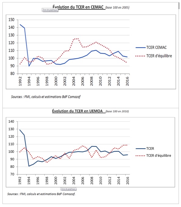 Graphique 3 : Taux de change effectif réel (TCER) des zones CEMAC & UEMOA comparés à leurs valeurs d’équilibre