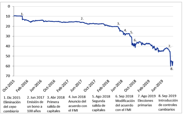 Peu après son élection, Macri est arrivé à un accord avec les créanciers de l’Argentine. Cet accord, avec l’élimination des restrictions de change (« cepo cambiario »), a permis au pays de se tourner de nouveau vers les marchés pour se financer. Le gouvernement a alors émis une importante quantité de dette externe pour soutenir le déficit primaire, au lieu de le réduire. Pendant les années 2016 et 2017, un large flux de capitaux étrangers est entré dans le pays grâce à l’optimisme général des marchés, ce qui a même permis au gouvernement d’émettre un bon à 100 ans (sursouscrit). Cependant, dès le début de 2018, 70% de la dette argentine était libellée en dollars, ce qui montrait sa forte dépendance du financement extérieur. D’autre part le déficit du compte courant avait également augmenté de façon significative.