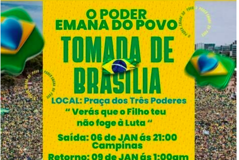 Car cette invasion un dimanche dans des bureaux vides n’est en rien une surprise. Depuis le 3 janvier, divers ultras bolsonaristes programmaient publiquement sur les réseaux sociaux une invasion de Brasilia. Nous le voyons à ce visuel de promotion du voyage sur les réseaux sociaux depuis une ville du Brésil (il existe d’autres visuels du même type pour d’autres localités), il était bien question de la « prise de Brasilia » (Tomada de Brasilia). Le voyage était payable en ligne avec des moyens facilement traçables par les autorités, preuve du degré d’absurdité de la démarche insurrectionnelle. Cette « prise » des institutions avait pour slogan « O poder emana do povo » (« le pouvoir émane du peuple ») : une formule qui figure dans la Constitution brésilienne, mais qui, dans la pure tradition populiste, est coupée de sa suite (« qui l'exerce par l’intermédiaire de représentants élus ou directement »).