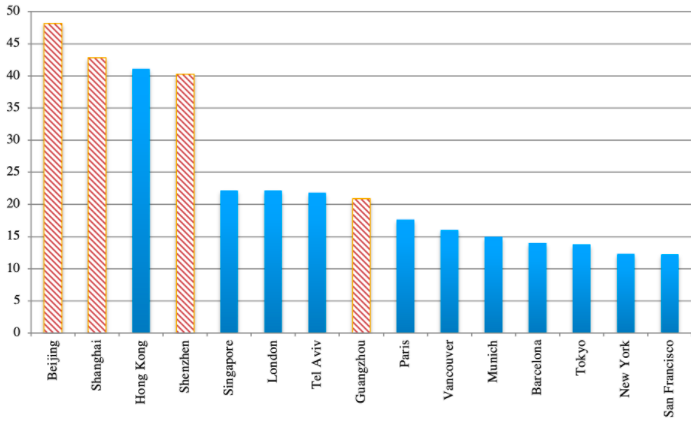 Note : Cette figure montre les ratios prix des logements/revenu à Pékin, Shanghai, Hong Kong, Shenzhen, Singapour, Tel Aviv, Guangzhou, Paris, Vancouver, Munich, Barcelone, Tokyo, New York et San Francisco, respectivement.