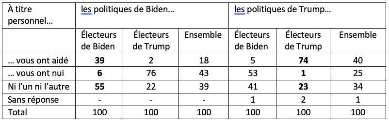 Du point de vue des politiques menées par les deux présidents, Trump remporte un avantage décisif (tableau 2). Les Américains estiment que les politiques de Trump les ont aidés plutôt qu’elles ne leur ont nui (« hurt »), tandis que celles de Biden leur ont nui plutôt qu’elles ne les ont aidés. Plus grave encore, tandis que 74% des électeurs de Trump estiment que ses politiques les ont aidés, seulement 39% des électeurs de Biden font la même réponse s’agissant de ses politiques. De même, les électeurs de Biden disent moins avoir souffert des politiques de Trump que les électeurs de Trump de celles de Biden.