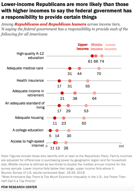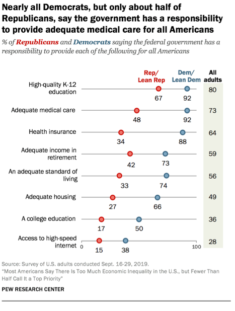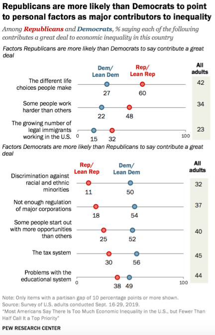 Si l’on considère les seuls individus qui estiment qu’il y a trop d’inégalités, les différences entre les deux groupes de sympathisants demeurent extrêmes. Les démocrates estiment que les inégalités pourraient être réduites en augmentant les taxes sur les plus riches et le salaire minimum, en étendant la couverture sociale à tous les âges et en supprimant pour les deux premières années les droits d’inscription dans les collèges publics. Les républicains, ne citent que la suppression de l’immigration illégale. Les uns et les autres ne se rejoignent que pour vouloir assurer à tous les compétences nécessaires pour les métiers d’aujourd’hui.