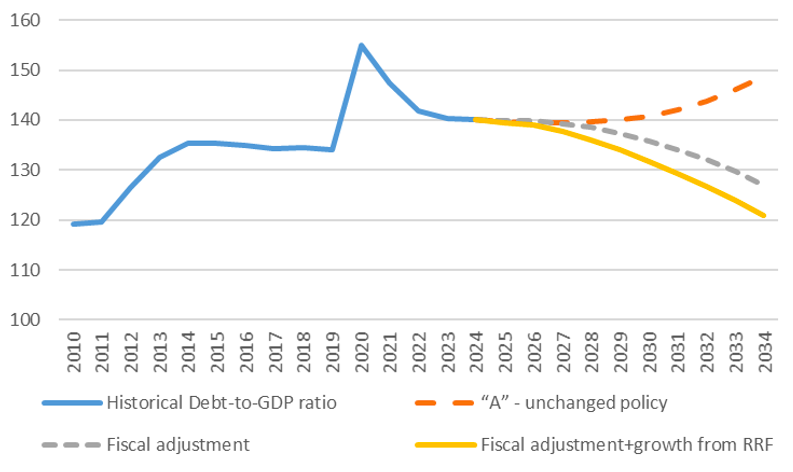 Cependant, le compromis final atteint sur les règles budgétaires de l’UE a également imposé deux exigences supplémentaires : 1) le ratio dette/PIB doit diminuer d’au moins 1% chaque année pendant le programme d’ajustement ; 2) l’ajustement doit se poursuivre jusqu’à ce que le déficit global/PIB soit inférieur à 1,5 % par an. La première contrainte est soutenable, la seconde pourrait imposer dans certaines circonstances un fardeau excessif et probablement insoutenable au pays[10].