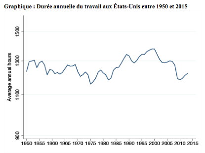 Tout cela serait entendu s’il n’y avait pas une grosse exception à cette tendance séculaire : les États-Unis. Le graphique qui suit, tiré du même article, regarde la durée annuelle du travail dans ce pays depuis 1950. Il y a des bosses et des creux, mais à tout le moins pas de tendance à la baisse. Les Américains, dont la durée hebdomadaire du travail était à peu près celle qu’on rencontrait en Europe dans les années 70, travaillent désormais de l’ordre de 3 h, 4 h, et 5 h de plus que respectivement les Britanniques, les Allemands et les Français.