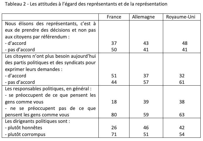 Ces attitudes de défiance à l’égard des institutions et du fonctionnement de la démocratie peuvent s’analyser comme une mise en cause du régime représentatif lui-même (tableau 2). Il faut d’abord remarquer que la critique des représentants est générale. Elle est cependant plus marquée en France. En particulier, les Français sont nettement plus nombreux à estimer n’avoir besoin ni des partis ni des syndicats pour exprimer leurs demandes. Ce rejet des représentants et des organisations traduit une sorte d’anomie politique en France qui s’est exprimée dans le mouvement des Gilets jaunes.