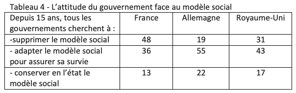 Le second exemple est encore plus frappant. Il s’agit de la perception de ce qu’ont été les objectifs réels des gouvernements successifs depuis quinze ans à l’égard du système de protection sociale (tableau 4).