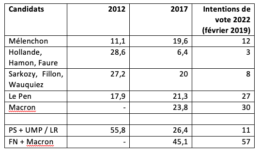 Résultats des élections présidentielles de 2012 et 2017 et Intentions de vote présidentiel en février 2019 (IFOP).