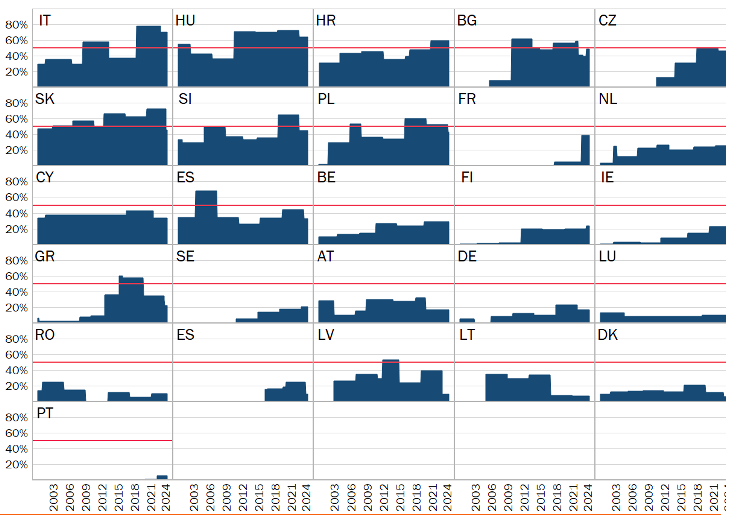 Les partis populistes détenaient la majorité des sièges dans trois États membres de l'UE en décembre 2023 : en Italie (70%), en Hongrie (64%) et en Croatie (59%). En outre, ils disposaient de plus d'un tiers des sièges en Bulgarie (49%), en Slovaquie (45%), en Slovénie (44%), en Pologne (42%), en France (38%), aux Pays-Bas (35%), à Chypre (34%) et en Espagne (33%).
