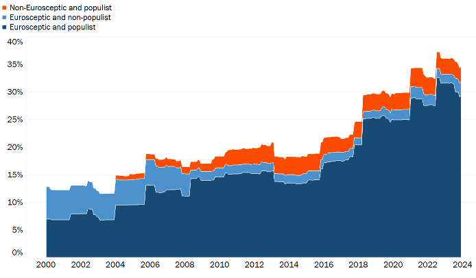 Parce que les partis populistes sont traditionnellement eurosceptiques, leur progression a coïncidé avec une représentation croissante des partis eurosceptiques dans l'UE. Toutefois, le narratif de ces partis ne semble plus relever d’une stratégie eurosceptique « dure » traditionnelle ; il viserait plutôt à porter à l’échelle de l’Union un discours qui séduit au niveau national et à l’incarner dans des politiques européennes. C’est dans cette perspective que l’on peut comprendre la « normalisation » de la droite conservatrice radicale et aussi extrême dans plusieurs pays européens dont la France. Le débat européen n’y est plus réduit au clivage pour ou contre l’Union européenne. Il est désormais davantage centré sur le projet politique, l’orientation des politiques européennes et les manques qui ont été révélées par les crises successives.