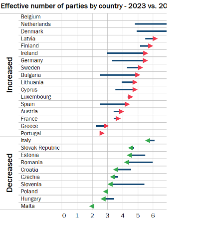 Figure 4. Fragmentation du paysage politique dans l'UE27. Nombre effectif de partis dans les parlements nationaux (au niveau UE puis par pays ; 2023 vs. 2000)