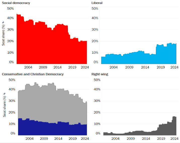 Les paysages politiques nationaux se sont en outre éloignés d’une division entre deux grands blocs de gauche et de droite pour se caractériser aujourd'hui par une quadripartition. Depuis 2000, les partis traditionnels (centre-gauche et centre-droit) ont perdu des sièges dans les parlements nationaux, tandis que les partis plus à droite et les libéraux en ont gagné.
