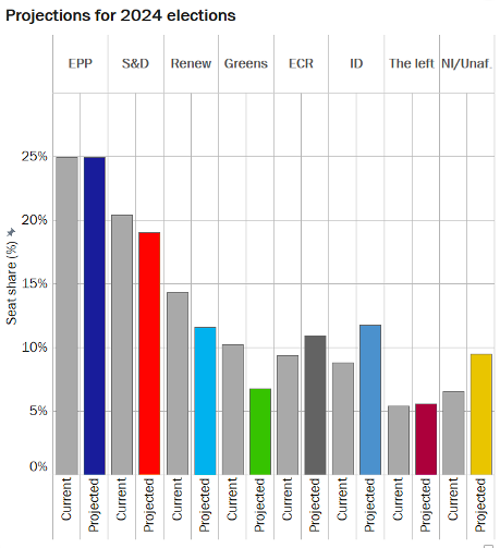 Figure 6. Élections au parlement européen en 2024. Projections par groupe politique et dans le temps
