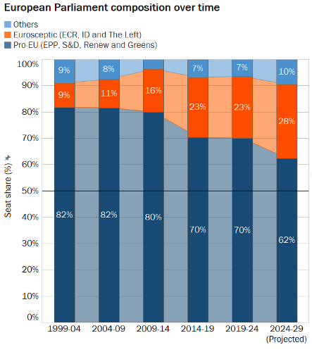 Source : Politico, Europe Elects et Parlement européen. Note : Les parts de sièges prévues pour chaque groupe politique correspondent à la moyenne de deux projections réalisées par Politico et Europe Elects. Les projections ont été réalisées le 1er avril (Politico) et le 31 mars (Europe Elects). Dans le panneau de droite, les groupes eurosceptiques et pro-UE comprennent les prédécesseurs des groupes politiques existants tels que l'ADLE (actuellement Renew) et l'ENF (actuellement ID).