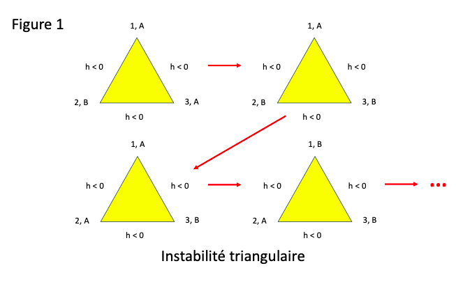 Triplet de pays 1, 2, 3 où chacun interagit avec les deux autres de façon conflictuelle. Il est alors impossible de satisfaire simultanément les trois paires d’interactions. En effet, dès que deux pays, par exemple 1 et 2 sont dans des coalitions opposées A et B (en haut à gauche), le troisième pays ne trouve plus de situation satisfaisante car il voudrait à la fois être en conflit avec les deux autres, ce qui est impossible car l’ennemi de mon ennemi étant mon ami, seules deux coalitions sont possibles. Si le pays 3 choisit la coalition A, il se retrouve bien en conflit avec 2 qui est en B, mais allié avec 1 qui est en A. Sa position est instable comme celle de 1. Seul 2 est pleinement satisfait. Si 3 change de coalition pour rejoindre B (en haut à droite), il reste insatisfait mais c’est maintenant 1 qui a pris la place de 2 alors celui-ci va rejoindre A (en bas à droite) rendant 3 satisfait à la place de 1, ce qui le pousse à passer en B (en bas à droite) et ainsi de suite sans fin pour ce cycle perpétuel et instable d’alliances. Deux pays peuvent aussi changer d’alliance simultanément.