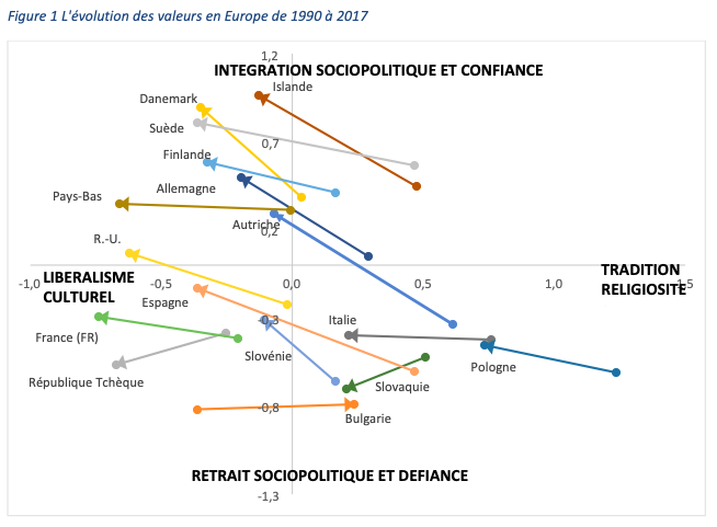 Quant à la France elle occupe une position assez singulière. Elle est à la pointe du libéralisme culturel et de la sécularisation religieuse en Europe, mais reste très en deçà du niveau moyen de confiance et d’intégration sociopolitique des autres pays d’Europe de l’Ouest. Entre les deux dates extrêmes des enquêtes (1990 et 2017), sa position a peu évolué sur ce plan, comme c’est le cas également de son voisin transalpin.