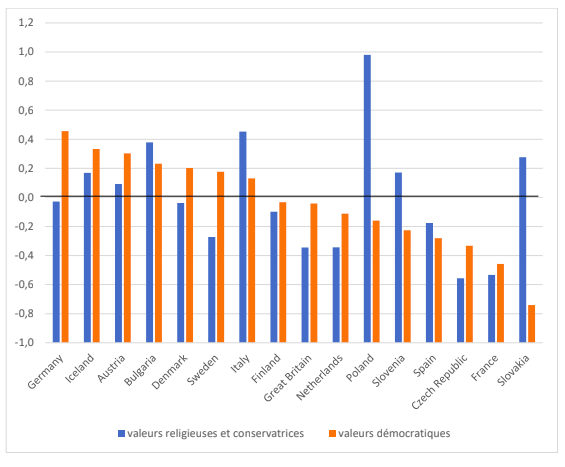 C’est le cas de la plupart des pays de l’Est, mais aussi de l’Espagne et surtout de la France qui a, juste avant la Slovaquie, le score le plus bas sur cet axe d’adhésion aux valeurs démocratiques. A l’inverse, notre voisin d’outre-Rhin est le pays enquêté qui y adhère le plus nettement. Le contraste entre la France et l’Allemagne sur ces enjeux démocratiques est saisissant alors que ces deux pays sont présentés, dans la rhétorique européenne, comme un « couple » qui fait avancer l’Europe. Sans doute les dirigeants français et allemands s’y emploient-ils, mais l’enquête montre que les populations des deux pays ne partagent pas les valeurs démocratiques à l’unisson. L’histoire de l’Allemagne a manifestement laissé dans la conscience collective des traces profondes qui immunisent la grande majorité de la population contre le virus autoritaire ou la fatigue démocratique. Il n’en est pas de même en France.