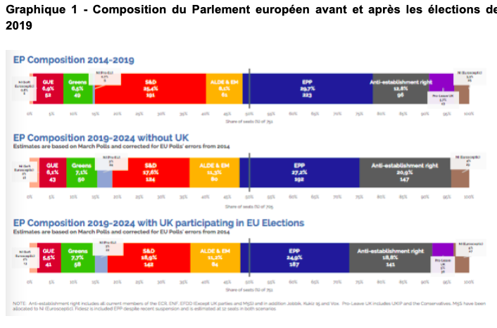 En conclusion, notre analyse suggère que le prochain Parlement européen sera plus fragmenté, indépendamment du Brexit. Par nécessité arithmétique, le positionnement des groupes politiques sur l'intégration européenne est susceptible d'être la clé pour former la majorité nécessaire à la nomination de la prochaine Commission européenne. Cette majorité sera cependant plus faible. Elle sera également hétérogène en termes de positionnement sur le spectre gauche-droite, les valeurs sociétales et les sujets politiques clivants. Cela pourrait conduire à des propositions législatives moins ambitieuses et à la formation de majorités ad hoc alternatives sur tel ou tel acte législatif. L'hétérogénéité de la coalition qui soutiendra la nouvelle Commission européenne et sa faiblesse au sein du Parlement européen pourraient en outre avoir un impact sur l'équilibre interinstitutionnel des pouvoirs au profit du Conseil européen et de l'approche intergouvernementale de la politique européenne, aux dépens de la Commission, du Parlement européen et de la méthode communautaire.