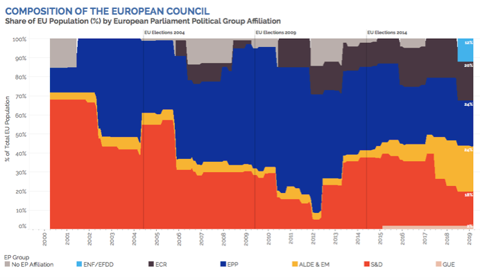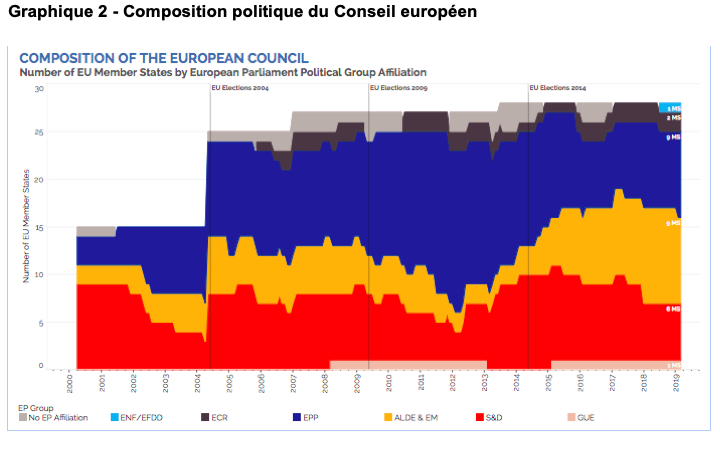 Cependant, le nouvel équilibre politique des pouvoirs au sein de l'UE ne peut être pleinement évalué qu'en tenant compte de l'équilibre actuel au Conseil européen, où le S&D, le PPE et les centristes / libéraux (ALDE / LREM) détiennent également une majorité qualifiée. Sur la base de l'affiliation politique du chef d'État ou de gouvernement de chaque État membre au Conseil européen, il est possible de comparer l'équilibre politique du Conseil avec celui du Parlement européen (graphique 2). En mars 2019, les dirigeants des États membres de l'UE étaient affiliés aux groupes PPE (9), ALDE (9), S&D (6), GUE / NGL (1), ECR (2), ENF / EFDD (1). Malgré les victoires électorales des partis « anti-establishment », par exemple en Italie, les représentants affiliés à des groupes pro-européens (S&D, PPE, ALDE et LREM) représentent toujours plus de 55% des Etats membres, représentant au moins 65% de la population de l'UE (les conditions requises pour atteindre une majorité qualifiée au Conseil). Dans ce contexte, le soutien de l'ALDE et de LREM au Conseil et son rôle pivot en tant que membre de la coalition au Parlement seront essentiels pour la nomination de la nouvelle Commission. Là encore, le Brexit ne sera pas déterminant.