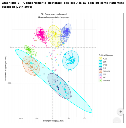 Nous analysons également dans quelle mesure les clivages traditionnels et de nouveaux clivages ont un impact sur la politique de l'UE. En particulier, les clivages traditionnels ont-ils encore des implications pratiques? Des catégories telles que gauche et droite sont-elles encore utiles pour comprendre la politique d'aujourd'hui? Les données empiriques permettent de répondre positivement à ces deux questions. Cheysson et Fraccaroli (2019) ont jeté un nouvel éclairage sur les transformations idéologiques au Parlement européen depuis 15 ans. En collectant tous les votes par appel nominal de 2004 à 2019, ils ont reconstitué les principales dimensions du comportement électoral des députés. Le graphique 3 montre les positions des groupes politiques sur la dimension gauche-droite et pro / anti UE pendant la législature actuelle du Parlement européen (2014-2019). Chaque point représente un député européen, coloré par l'appartenance à son groupe politique et situé en fonction de son score sur les deux dimensions principales. Les résultats montrent que le clivage le plus important, c’est-à-dire la dimension permettant d'expliquer la plus grande partie des votes (26,42%), correspond à la dimension pro / anti-UE, alors que le second clivage (20,39%) correspond à la dimension gauche-droite.