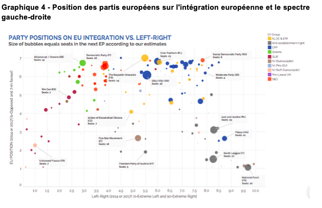 La pertinence constante du clivage sur l'intégration européenne indique que le positionnement des partis sur la question pourrait constituer une force centrifuge dans la formation d'une coalition au Parlement européen pour la nomination du président de la Commission au prix d'une hétérogénéité significative sur le spectre gauche-droite. Le graphique 4 présente la position des différents partis nationaux, ainsi que leur taille et leur appartenance à un groupe politique, en fonction de leur positionnement sur l'intégration européenne (axe des ordonnées) et sur le spectre gauche-droite (axe des abscisses) tel qu’évalué par le Chapel Hill Experts’ Survey. Ce graphique peut être comparé au graphique 3, qui montre le comportement de vote selon les mêmes dimensions que les députés européens lors du mandat précédent. Les chiffres indiquent donc que, si d’autres clivages apparaissent en Europe, les positions sur l’intégration européenne sont plutôt homogènes et cohérentes entre la majorité des partis nationaux et les députés actuels. Ce clivage semble donc à même de réunir le S&D, le PPE et l'ALDE (et si nécessaire également les Verts) pour constituer une majorité de députés.