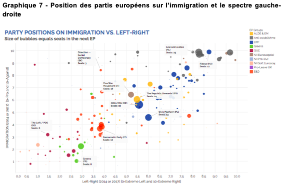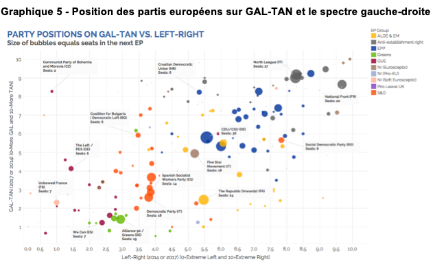 Néanmoins, même si des clivages traditionnels tel que celui sur l'intégration européenne devraient encore jouer un rôle dans la formation d'une majorité pour la Commission, les clivages liés aux valeurs sociétales façonnent de plus en plus le discours politique et les positions sur des questions essentielles telles que l'immigration. Ces clivages pourraient constituer la base de la formation de majorités ad hoc sur tel ou tel sujet au cours de la prochaine législature. Ceci est en partie le résultat d'un changement stratégique des partis traditionnellement eurosceptiques qui ne défendent plus officiellement le rejet du principe de l’appartenance à l’UE (europhobie). À l'heure actuelle, le soutien à l'UE et à la monnaie unique atteint un niveau record et, dans ce contexte, les partis eurosceptiques semblent considérer que les gains électoraux d'un discours purement anti-européen (anti-UE et / ou anti-euro) ont diminué. La structuration du débat politique européen se concentre donc de moins en moins sur le clivage entre pro / anti UE et de plus en plus sur les valeurs sociétales opposant le «libéralisme culturel» au conservatisme ou même à une idéologie réactionnaire. Il est notable que le positionnement sur les valeurs sociétales est très corrélé au positionnement sur le spectre gauche-droite (graphique 5), ce qui pourrait contribuer à redéfinir ce dernier et lui redonner de l’importance.