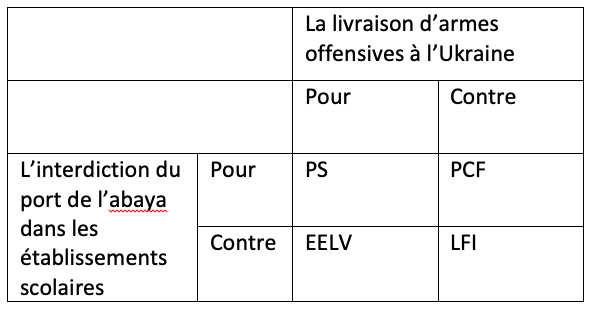Non seulement Mélenchon, qui a par avance exclu une primaire pour désigner le (la) candidat (e) de gauche à la prochaine élection présidentielle, sera très probablement candidat, ce qui, compte tenu de la radicalisation de son discours, rend peu probable que l’ensemble des formations le soutiennent (le PS et le PCF n’ont pas participé à la manifestation contre les « violences policières » du 23 septembre), mais encore il est tout aussi peu probable que les autres composantes de la gauche s’accordent sur une candidature commune. Le schéma ci-dessous le montre en prenant seulement en compte deux des enjeux qui divisent la gauche : la guerre en Ukraine et le port de l’abaya dans les établissements scolaires.