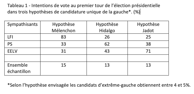 Dans une telle situation, il serait logique de penser qu’une candidature unique de la gauche pourrait seule permettre à celle-ci d’être présente au second tour. Le PS appelle depuis longtemps à un tel rassemblement. Les écologistes et Mélenchon sont d’accord mais à condition que le candidat unique soit celui de leur mouvement. Pourtant il s’agit là d’une illusion. La lecture de l’enquête montre, de manière contre intuitive, qu’une telle tactique ne présenterait aucun avantage par rapport à des candidatures séparées et serait même plus catastrophique encore. En effet, dans le cas d’une candidature unique l’hypothèse Mélenchon donne 15% et les hypothèses Hidalgo et Jadot chacune 13% (tableau 1). Le total de l’électorat de gauche serait ainsi divisé par deux. Comment expliquer un tel phénomène ?