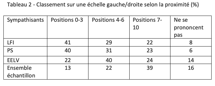 Nous disposons d’une enquête de l’IFOP de juillet dernier qui invite les personnes interrogées à se situer sur une échelle gauche/droite en onze positions, l’institut classant à gauche celles qui se situent sur les positions de 0 à 3 (tableau 2).