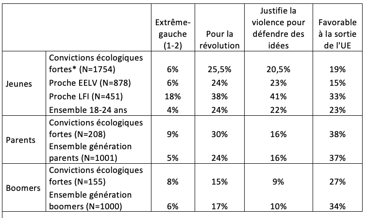 Ces jeunes qui constituent les gros bataillons d’EELV (ils se disent deux fois plus souvent proches de ce parti que les générations plus âgées) sont d’ailleurs plutôt moins radicaux que la génération de leurs parents qui, lorsqu’ils affirment de fortes convictions écologiques, sont plus souvent à l’extrême-gauche, et plus souvent pour une transformation radicale de la société et une sortie de l’UE. Chez les sympathisants écologistes, la jeune génération est plus modérée que la génération des parents (sauf, il faut le noter, sur la justification de la violence).