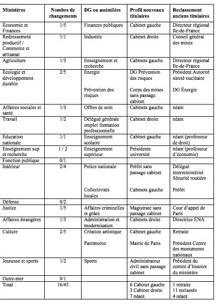 On retrouve là une tendance générale : les nouveaux gouvernants, surtout si en 1981 comme en 2012, ils n’ont qu’une faible expérience ministérielle, ont d’abord besoin de s’appuyer sur l’expérience des serviteurs de l’État en place. Ceux même marqués par leurs liens avec l’équipe précédente ont leurs chances s’ils se montrent loyaux. Seules quelques têtes symboliques sont coupées, ce qui suffit à nourrir une polémique habituelle de la part de l’opposition. Ce n’est que dans la durée qu’une majorité imprime une orientation politique dominante dans les emplois publics supérieurs. La droite a eu largement le temps de le faire en dix ans, la gauche mettra plusieurs années à déplacer sensiblement le curseur.